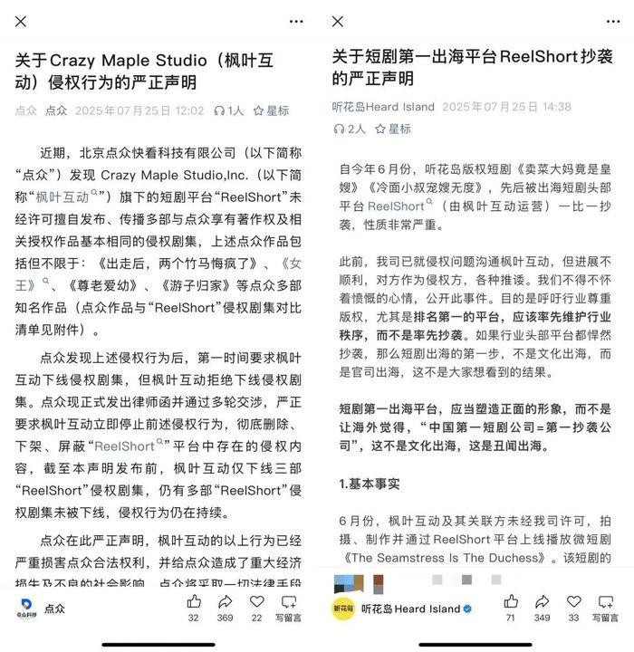 今年6月,听花岛曾指控自家短剧《家里家外》被南京烛影心光公司侵权抄袭。最近,这股“抄袭风”已经蔓延至海外;7月25日,听花岛和点众科技在同一天发布声明称,“短剧第一出海平台”ReelShort上线播放的多部海外短剧与其国内权利作品“基本相同”、涉嫌“一比一抄袭”。