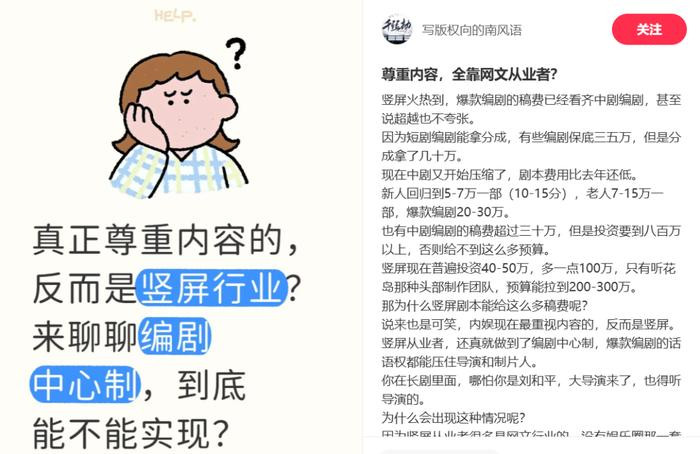 已经售出多部影视版权的作者、编剧南风语公开表示,爆款编剧的稿费已经看齐中剧编剧,甚至说超越也不夸张。