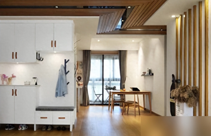 方方正正的户型跟块刚蒸好的实心馒头,每寸空间都不浪费——进门那L型玄关柜,简直是为懒人设计的:钥匙挂架就安在抬手的位置,不用翻包找;换鞋有矮凳,不用单脚跳着扒拉拖鞋;外套包包顺手塞进去,进门连快递盒都没地方堆,这才叫“卸下疲惫”啊,不是那种小玄关堆得跟闯关似的,进个门得绕三圈。