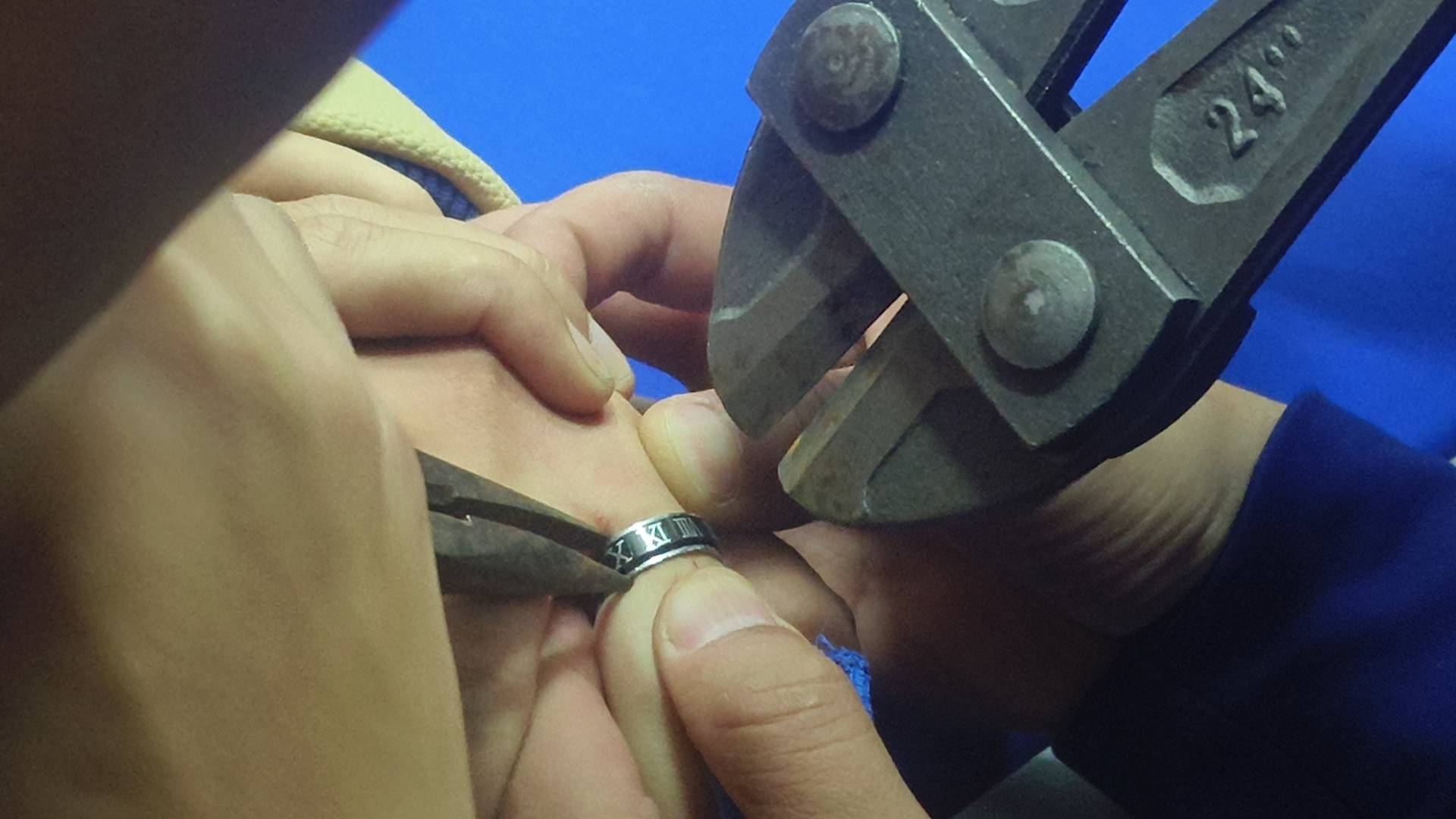 消防救援人员仔细检查后发现,男孩手指被一枚不锈钢戒指紧紧卡住,已经出现明显红肿,若不及时摘除,可能会影响血液循环,引发更严重的后果。消防救援人员立即行动,一人紧握断线钳,另外两人小心翼翼固定住男孩的手指,防止其晃动受伤。随着“咔嚓”一声脆响,戒指应声断开,被成功取下。整个救援过程仅用两分钟,男孩手指并无大碍。